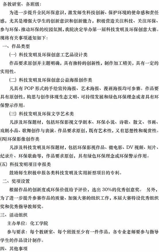 关于举办太阳集团tyc138第一届科技发明及环保创意大赛的通知