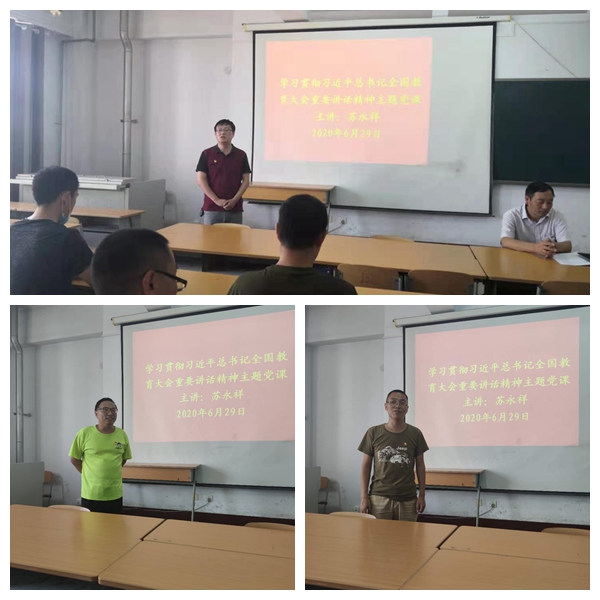 “七一”前夕(6月29日下午),院长苏永祥以《学习贯彻习近平总书记全国教育大会重要讲话精神》为主题为学院教工党员讲授党课,苏院长紧紧围绕习近平总书记讲话中的“九个坚持”的重要价值和科学内涵,全面阐释了习近平新时代中国特色社会主义思想关于教育的重要组成部分,是中国特色社会主义教育理论体系的思想指南,是中国特色社会主义教育实践的行动纲领。苏院长指出:作为一名教育工作者,如何在工作岗位上做到习近平总书记的讲话要求,首先就是要理解好、贯彻好习近平总书记的讲话精神,并付诸于工作中,作为一名教师党员,都必须学政治、懂政治、讲政治,担负起立德树人的时代重任,培养出一代又一代又红又专的社会主义建设者和接班人。