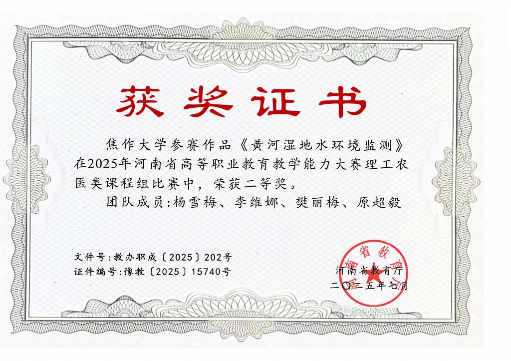 近日,河南省高等职业教育教学能力大赛评选结果揭晓,我院杨雪梅教师团队凭借《黄河湿地水环境监测》参赛作品,脱颖而出斩获二等奖,充分彰显了我院教师扎实的教学功底与创新的教学改革成果。
