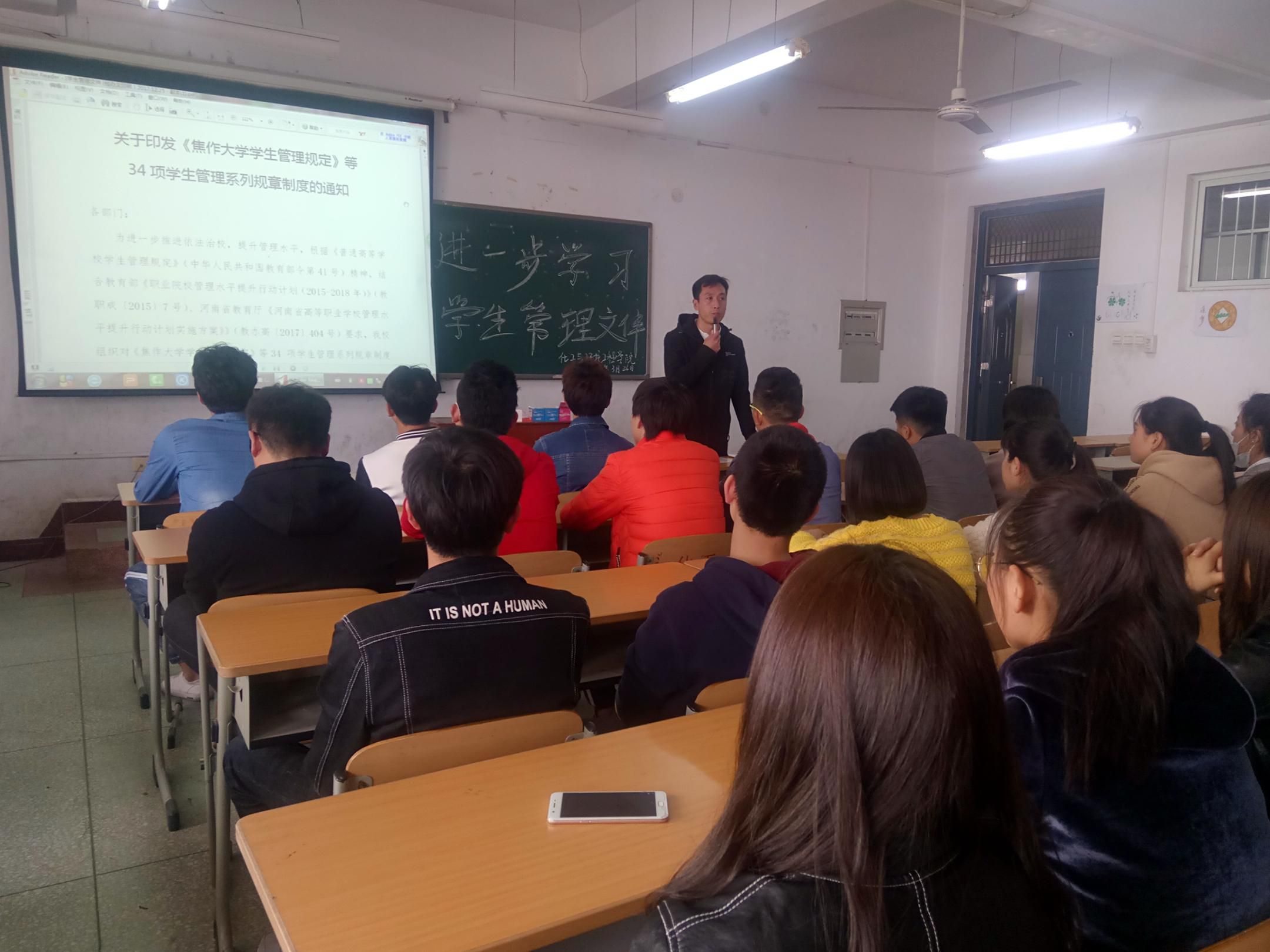 2018年3月26日,按照ok138cn太阳集团关于在学生中开展《ok138cn太阳集团学生管理规定》学习教育的要求,太阳集团tyc138在二教楼601教室召开学习学生管理规章制度主题班会,辅导员燕兴海、董蒙蒙两位老师主持了班会。