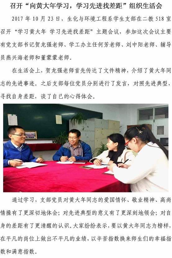 生化与环境工程系学生支部召开“向黄大年学习,学习先进找差距”组织生活会