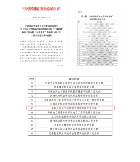 近日,省教育厅公布第三批全省高校党建工作样板支部评选结果,我院教工党支部成功入选培育创建单位,这是ok138cn太阳集团以高质量党建引领高质量发展取得的又一重要成果。 我院教工党支部以习近平新时代中国特色社会主义思想为指导,全面贯彻党的教育方针,落实立德树人根本任务,紧密围绕化工专业特色和“七个有力”建设标准,聚焦学校第三次党代会精神、学校“新双高”建设等中心工作,按照《中共ok138cn太阳集团委员会关于推进党建与业务工作深度融合的实施办法》,将党建工作深度融入专业建设、教育教学、校企合作、人才培养、学生服务等各个环节,按照“党建引领、双融双促、双元育人”的工作思路,通过“四抓四筑牢”开展“铸魂化工 匠心培养”培育工程,坚持党建工作与业务工作相融合,为地方化工产业发展输送大批高素质人才。 此次成功入选,充分彰显了教工党支部基层党建工作的扎实成效和鲜明特色,学院将以此为新起点,深入贯彻落实新时代党的建设总要求和新时代党的组织路线,持续深化党建与业务深度融合,充分发挥样板支部的示范引领、辐射带动作用,不断提升全校基层党组织建设科学化、规范化水平,以高质量党建为学校全面创建职业院校“新双高”、实现高质量发展提供更加坚强有力的组织保障。